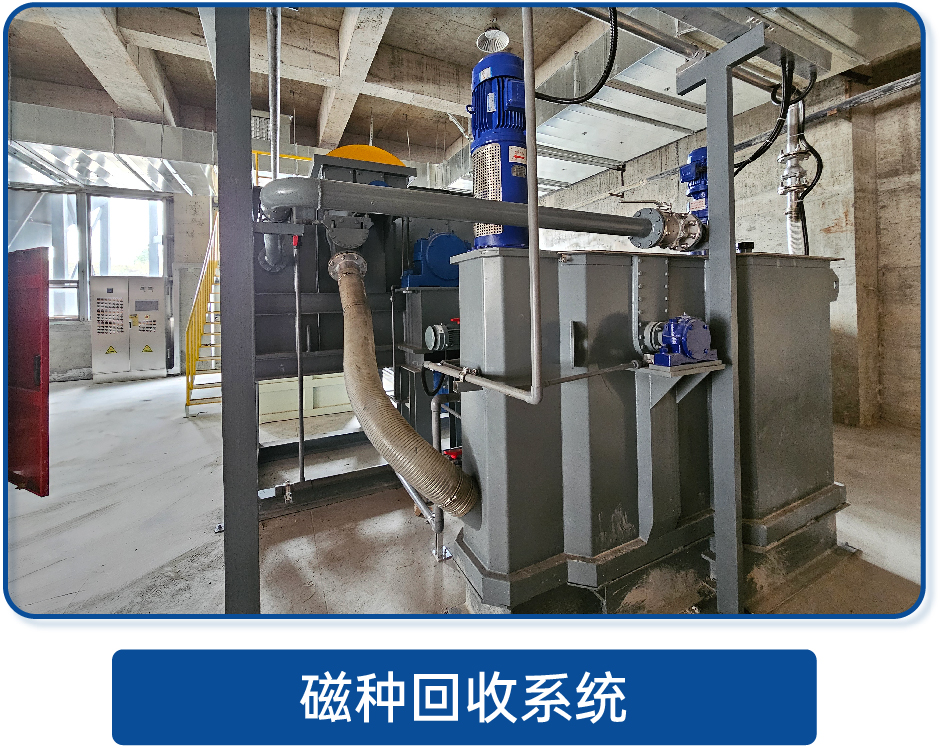我司為其設(shè)計(jì)的總體方案中,同時(shí)兼顧處理效果與用地緊張的矛盾,選用超磁分離為主體工藝技術(shù),選礦廢水經(jīng)預(yù)處理后進(jìn)入超磁分離設(shè)備,在改性磁種的作用下完成絮凝反應(yīng)后,通過永磁磁盤實(shí)現(xiàn)快速泥水分離,從而高效降低水中的SS,滿足了該礦尾水循環(huán)利用的生產(chǎn)要求。