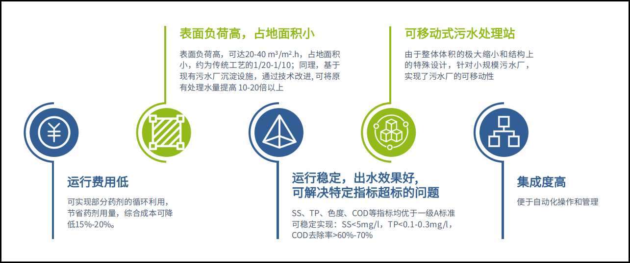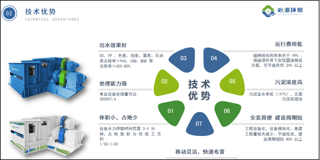 該技術(shù)是通過向惰性污水中投加可循環(huán)利用的磁種,并在混凝劑和絮凝劑共同作用下形成磁絮凝體,然后利用稀土永磁磁盤產(chǎn)生的強(qiáng)磁場(chǎng)作用(磁力強(qiáng)度是其自身重量的600多倍),在瞬間(約2秒鐘內(nèi))實(shí)現(xiàn)污水固液分離的過程,來達(dá)到消除污水中絕大部分污染物的目的。